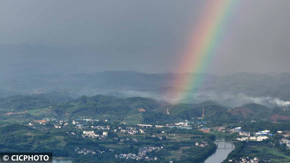 以上圖片:2025年9月11日在廣西柳州市融安縣拍攝的雨后彩虹。(無人機照片)CICPHOTO/譚克興 攝