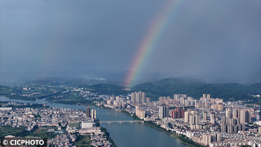 2025年9月11日午后,一場陣雨突襲廣西柳州市融安縣,給燥熱的大地帶來了一絲清涼。陣雨過后,融安縣城的天空中架起了一道色彩鮮艷、邊界清晰的絢麗彩虹,為桂北秋日增添一道靚麗的風景。