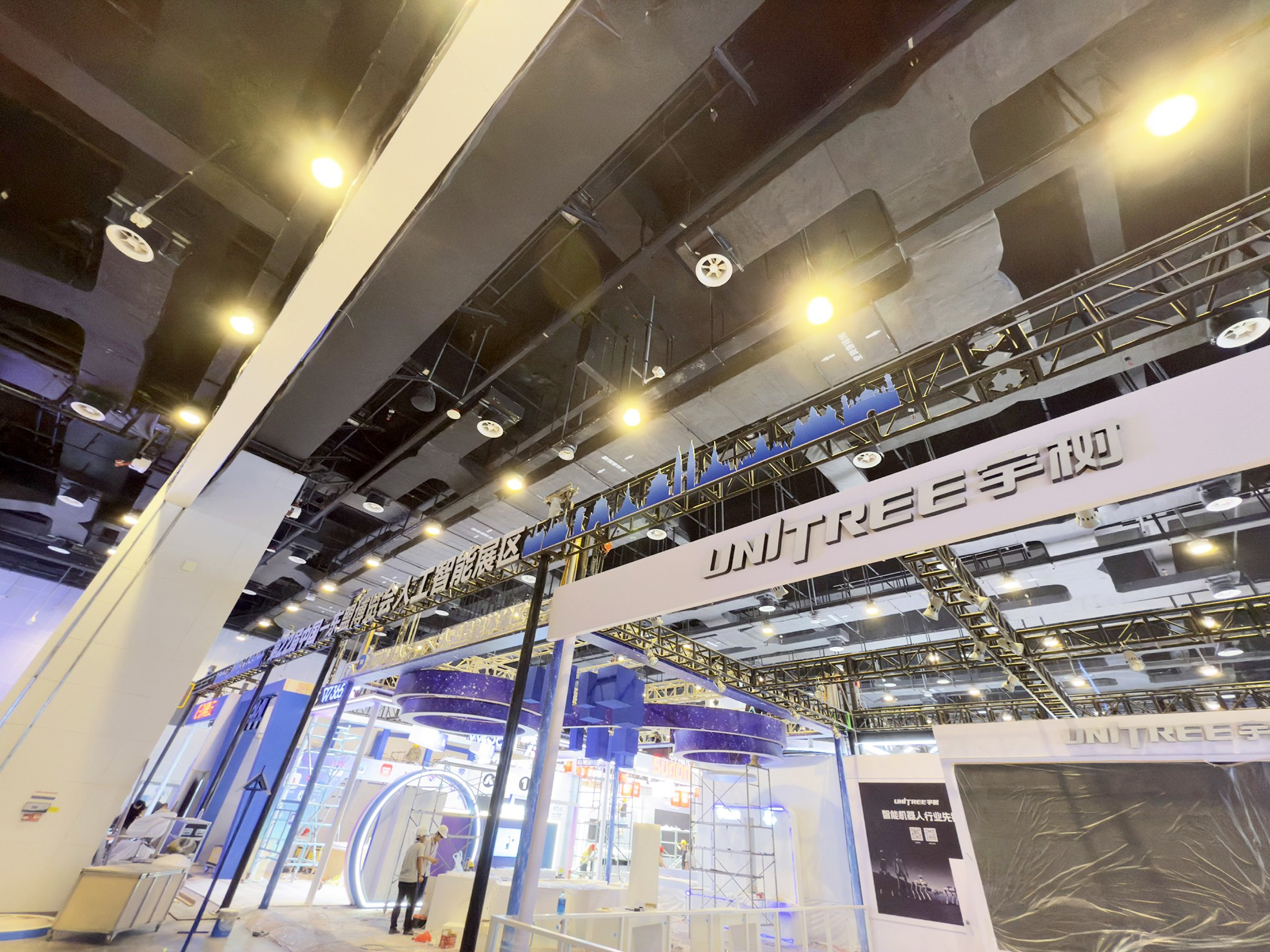 剛踏進場館,熱火朝天的施工氛圍便撲面而來,運送展品的車輛絡繹不絕,起重設備運轉聲、工作人員調度聲、設備調試提示音此起彼伏。步入AI專館,宇樹、華為、阿里云、科大訊飛等國內人工智能領域領軍企業的展位已初具雛形,工人們正有條不紊地進行結構加固、線路敷設、展臺裝飾等最后的沖刺工作。