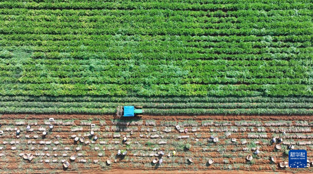 9月19日,在廣西柳州市柳城縣馬山鎮,工人在收獲子姜(無人機照片)。