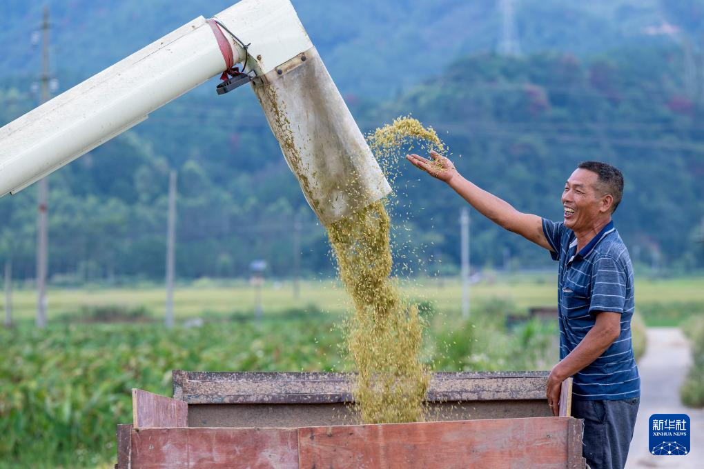 9月18日,在廣西賀州市鐘山縣紅花鎮古樓村,農民在收獲谷子。