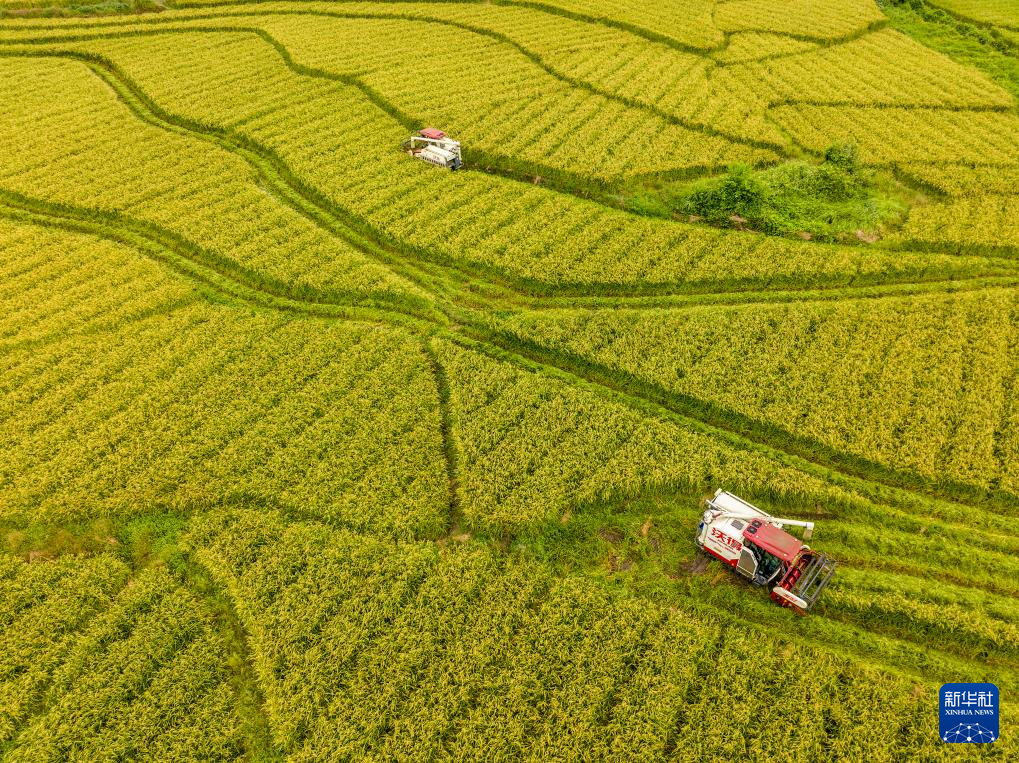 9月18日,在廣西賀州市鐘山縣紅花鎮古樓村,農民駕駛收割機在收割稻谷(無人機照片)。