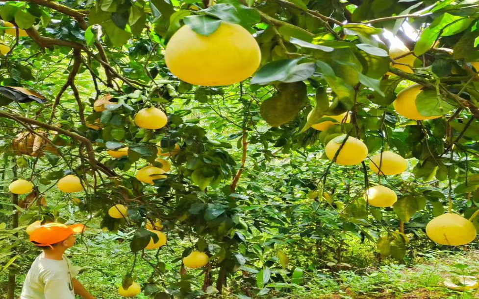 眼下,正是蜜柚成熟的季節。站在玉林市容縣的山坡上望去,一片片柚子林盡收眼底,黃燦燦的柚子沉甸甸綴滿枝頭?!艾F在正是蜜柚上市的季節。這是剛摘的蜜柚,果肉細嫩多汁,口感清爽香甜,今年預計產量達3000斤?!比菘h浪水鎮長壽村沙田柚種植農場負責人胡玉生說,農場還種有100畝沙田柚,一個月后也將迎來豐收,初步預計產量達300噸。