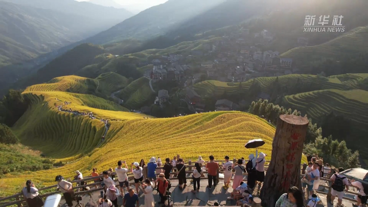 國慶中秋假期,廣西桂林市龍勝各族自治縣龍脊梯田水稻披金,層層疊疊的金黃稻田,吸引了世界各地的游客前來觀賞。