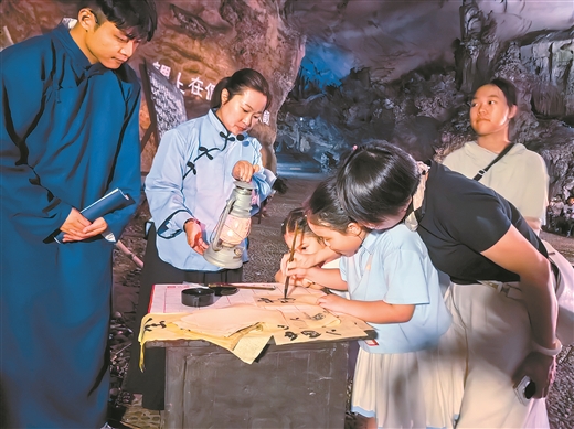 在七星巖洞內,身著藍色長衫的“教師”何忠善手持泛黃書本,帶領20余名游客齊聲高唱《巖洞教育歌》,熟悉的旋律將抗戰時期的教育場景生動再現。何忠善告訴記者,每場演出都有數十位游客參與其中,看到游客們沉浸演繹的神情,他愈發感受到傳承歷史記憶的責任之重。