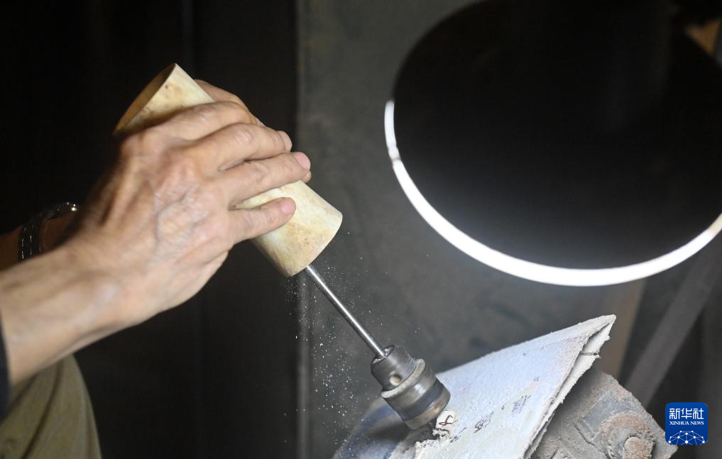 10月10日,黃一格在家中雕刻一把馬骨胡的琴頭。