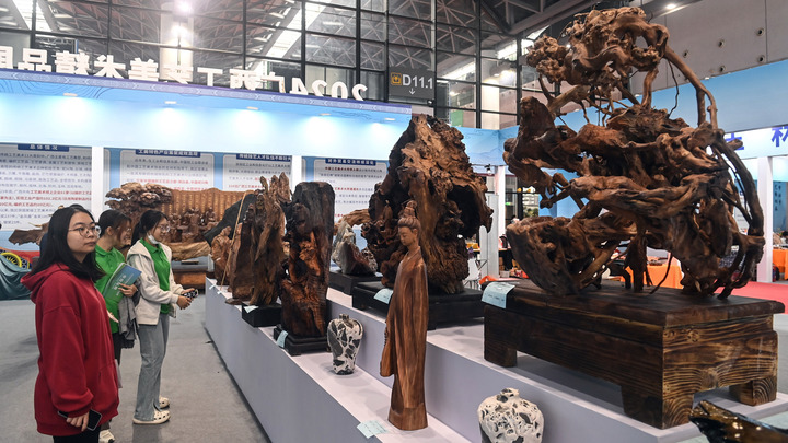 2024年世界林木業大會公眾開放日,觀眾和客商前來參觀選購木質工藝美術品。新華社記者張愛林 攝