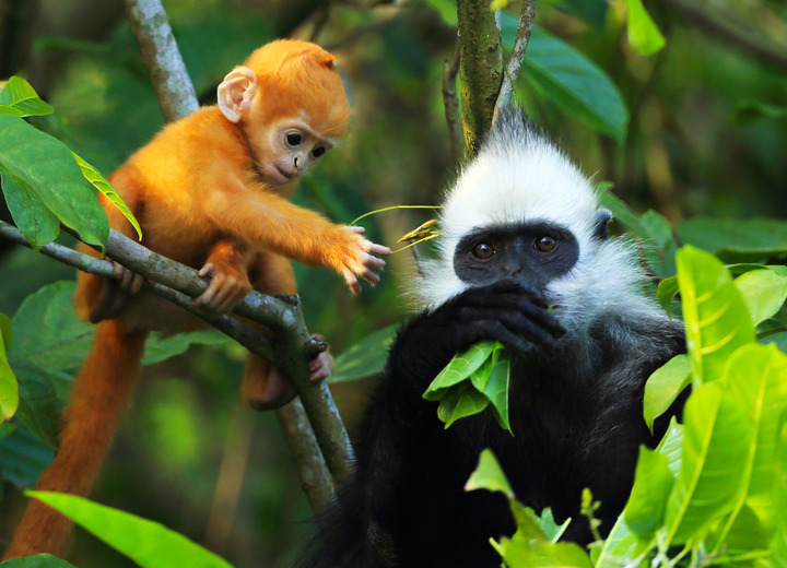 圖為白頭葉猴雌猴及幼崽。廣西崇左白頭葉猴國家級自然保護區管理中心 供圖