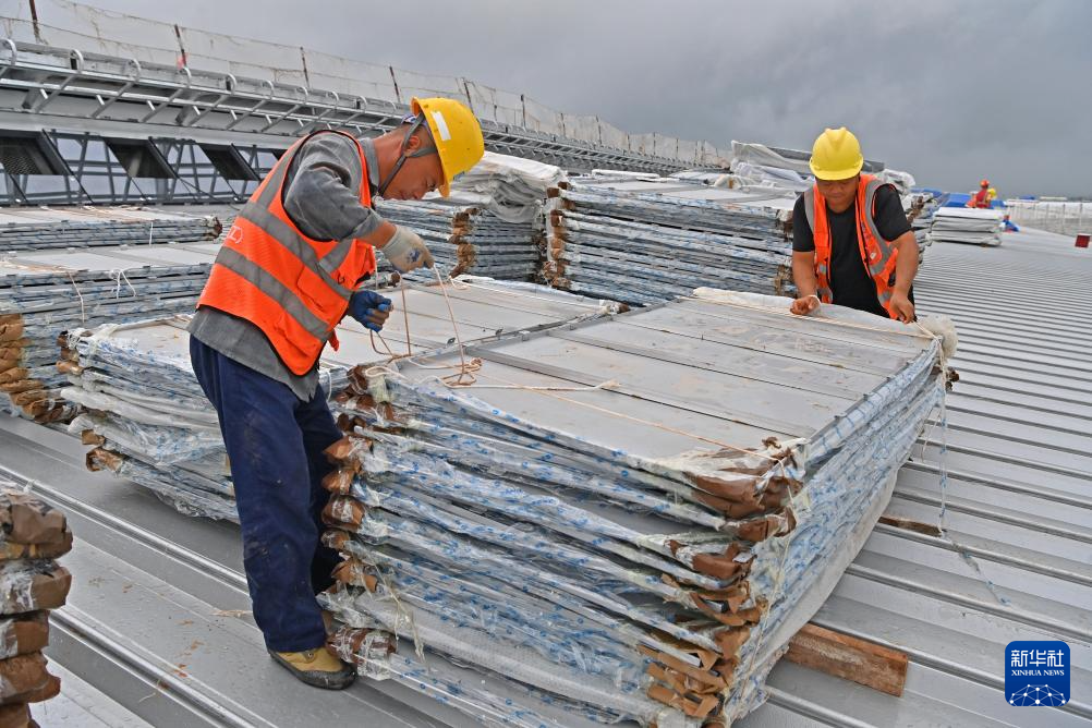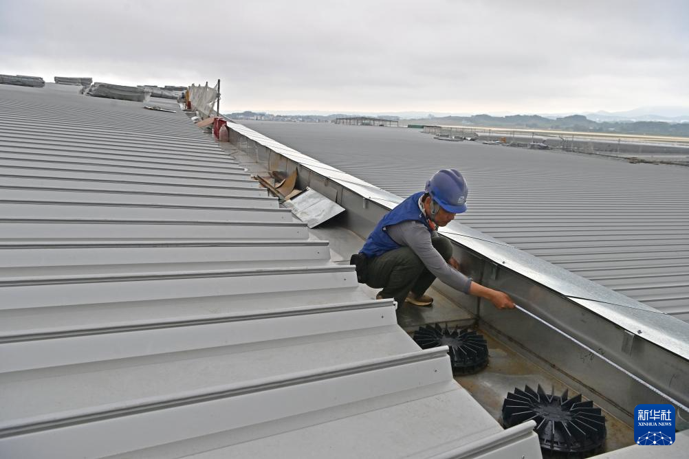 10月15日,中建二局的建設者在南寧吳圩國際機場T3航站樓二標段金屬屋面上捆扎檐口蓋板。