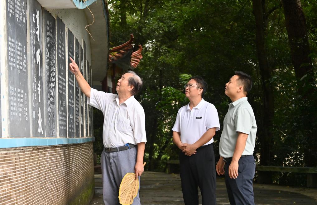 10月15日,在廣西河池市巴馬民族師范學校桂嶺碑林長廊,羅伏龍(左一)在談詩詞和書法創作體會。新華社記者陸波岸 攝