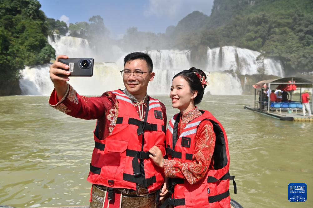 10月18日,一對新婚夫妻在中越德天(板約)瀑布跨境旅游合作區自拍。