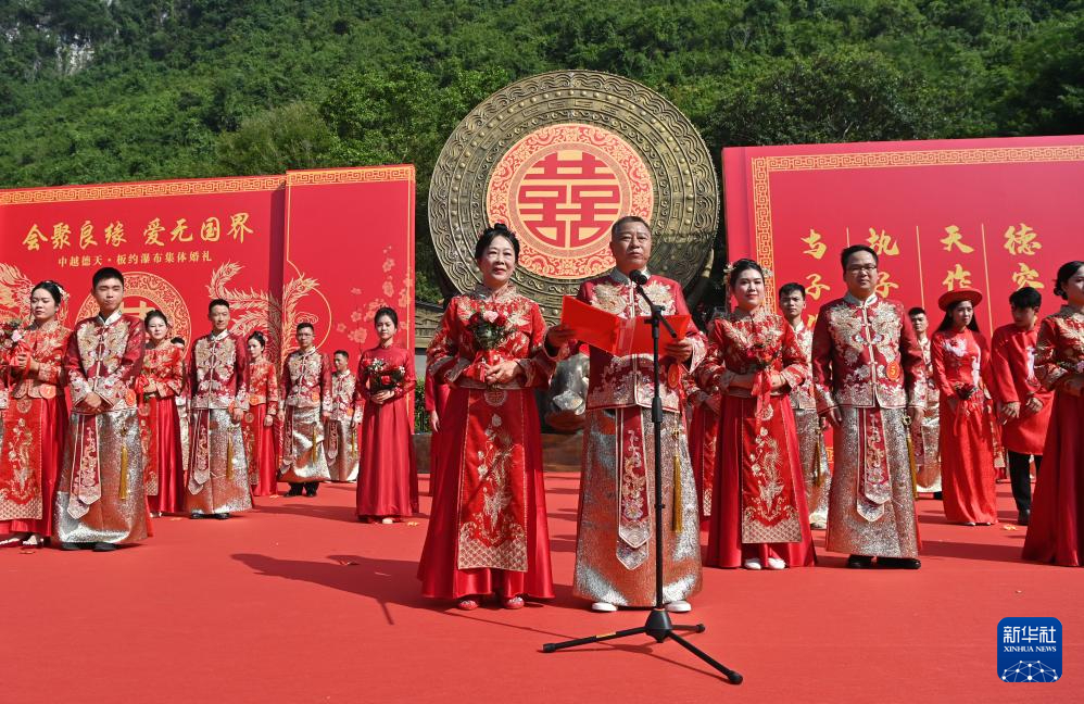 10月18日,“會聚良緣 愛無國界”中越德天(板約)瀑布集體婚禮在廣西大新縣中越德天(板約)瀑布跨境旅游合作區舉行,中越兩國39對夫妻參與,除新婚夫妻外,還有金婚、銀婚夫妻參與活動。