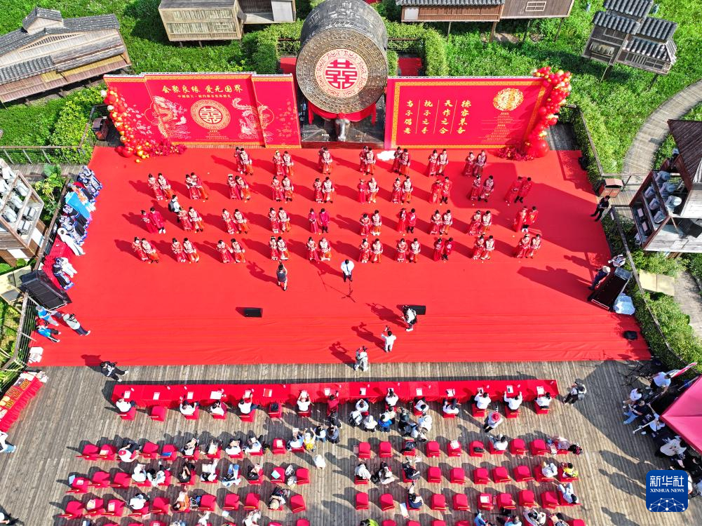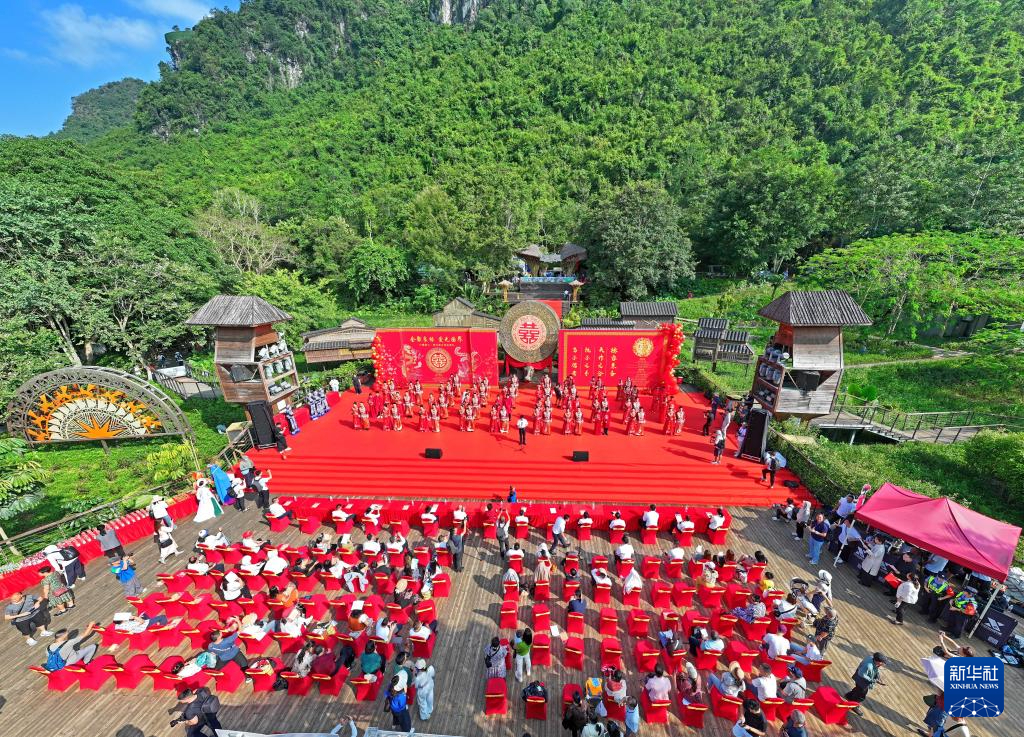這是10月18日拍攝的中越德天(板約)瀑布集體婚禮儀式現場(無人機照片)。