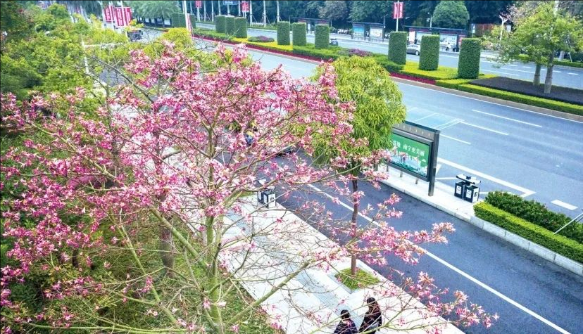 民族大道新民立交橋下,炮仗花與三角梅爭艷。 記者潘浩 攝