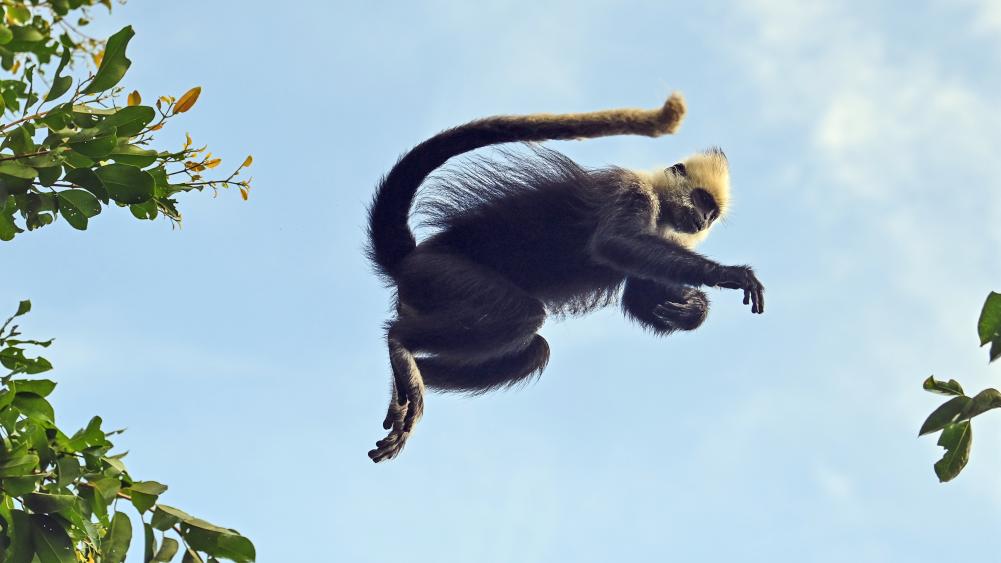 在崇左市江州區羅白鄉的白頭葉猴國家級自然保護區,一只白頭葉猴在樹林里活動。(2023年8月5日攝)。新華社記者 張愛林 攝