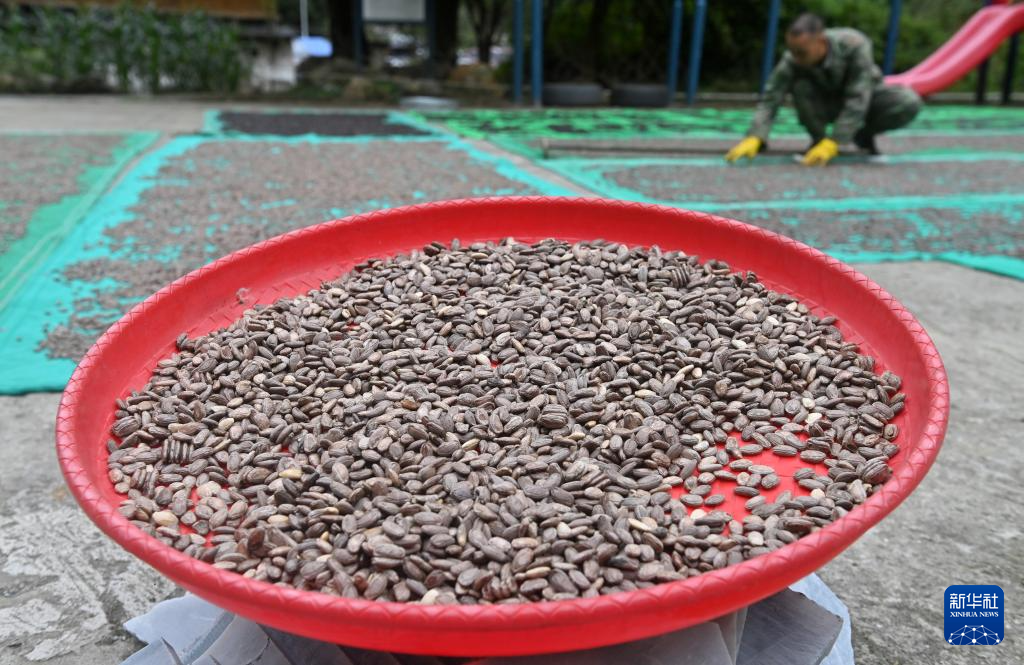 10月21日,在廣西龍勝各族自治縣三門鎮大地村,村民在晾曬吊瓜籽。