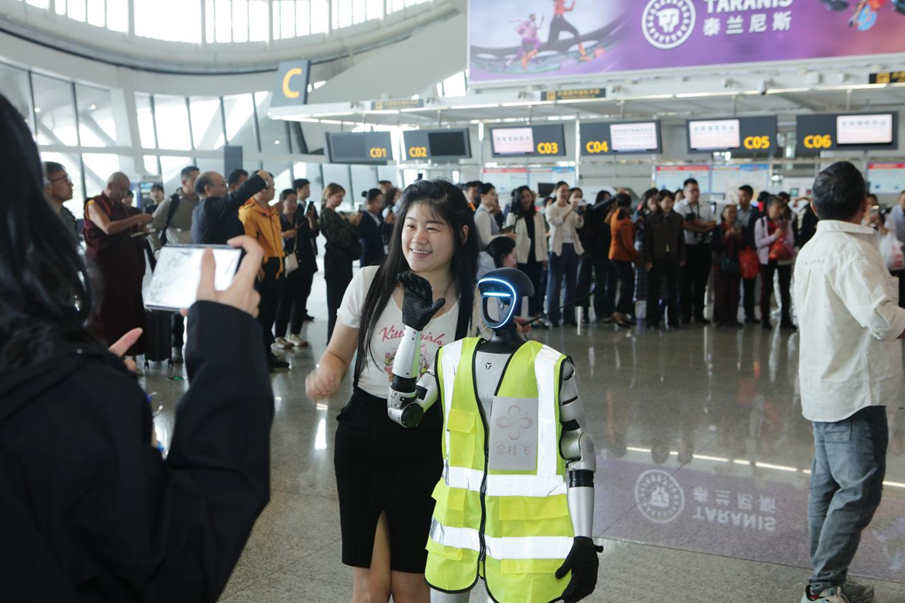 活動現場,AI機器狗“笨笨”以“科技向導”的身份開啟巡場互動,其靈動的姿態、友好的互動模式以及定制禮品派送服務,贏得旅客們的喜愛。隨后,人形機器人伴隨音樂表演機械舞和傳統武術,大家紛紛用鏡頭記錄下精彩瞬間?!癆I遛狗挑戰賽”“機器人舞蹈battle”“AI合影打卡”等特色活動接連開展。同時,機器人變身為“民航專家”,向旅客普及航空安全知識,進一步豐富了活動的科普內涵。