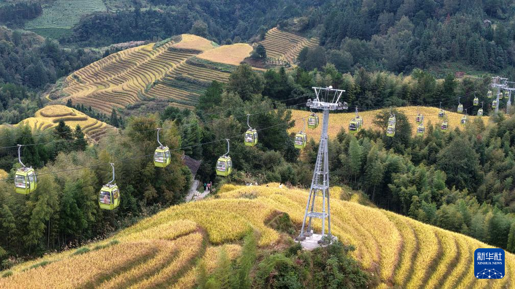 10月22日,游客乘坐纜車在廣西龍勝各族自治縣龍脊梯田觀光(無人機照片)。