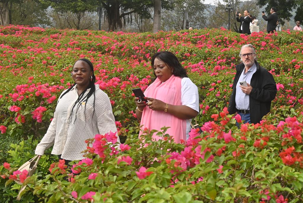 在南寧青秀山,晨霧散去后,三角梅熱烈綻放,蝴蝶蘭點綴林間,孔雀邁著優雅的步子與游人親近互動。樹蔭下,身穿壯族服飾的一家人正在野餐,其樂融融的畫面引得使節們紛紛上前合影。