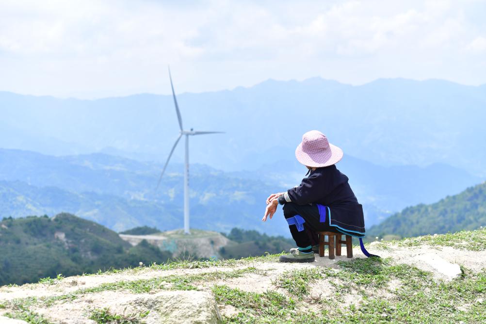 在廣西融水苗族自治縣桿洞鄉堯告村高山牧場,老人在山頂眺望遠山(2021年8月22日攝)。
