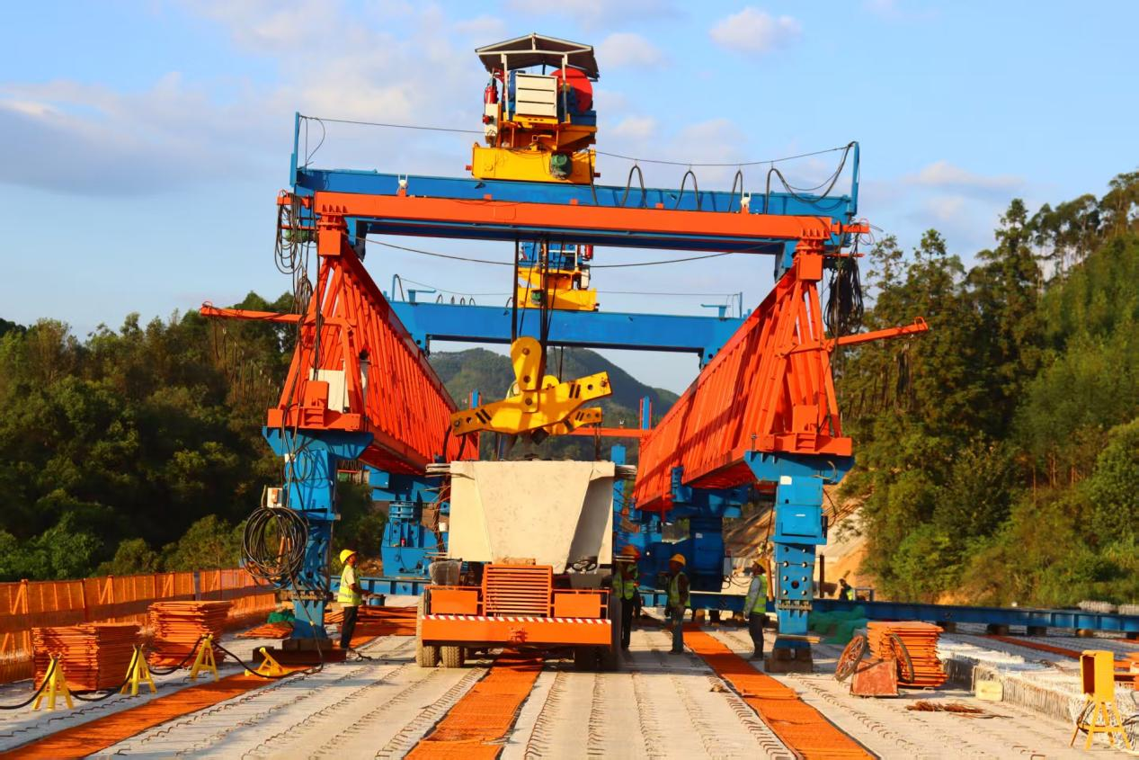 此次貫通的土建一標項目由中鐵十一局負責施工,標段全長10.92公里,設計時速120公里,為雙向四車道高速公路。該標段起點順接梧柳高速與規劃中的梧州至樂業公路(魚峰—宜州段)交叉處,終點與正在建設的賀巴高速相接,起訖里程為K0+784~K11+705。標段內共設置2座樞紐互通、14座橋梁,工程量大、施工組織復雜,且上跨車流量密集的梧柳高速,施工安全風險高,同時還要克服巖溶地質、交叉施工、跨線施工等難點。其中,盤龍大橋作為標段控制性工程之一,全長510米,共架設30米箱梁136片。