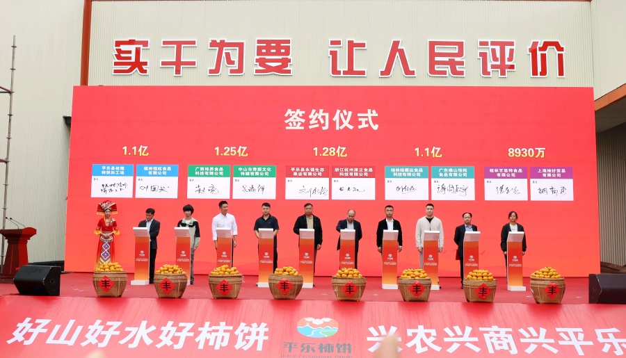 11月8日,“好山好水好柿餅·興農興商興平樂”平樂縣2025年柿子產品產銷對接會暨“平樂柿餅”區域公用品牌發布會在平樂縣沙子鎮舉行,正式發布“平樂柿餅”區域公用品牌,標志著平樂柿餅邁入了品牌化發展的新階段。當天,20多家外地客商與當地企業現場簽訂了平樂柿餅購銷協議,總金額超11億元。