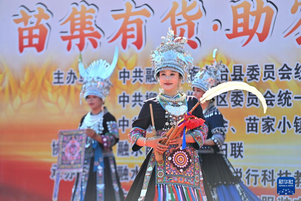 11月15日,在融水縣融水鎮苗家小鎮社區,演員展示蘆笙和苗繡。