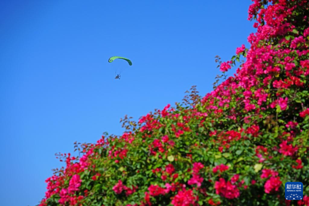 11月15日,動力傘愛好者在廣西南寧市青秀山風景區三角梅旁飛過。