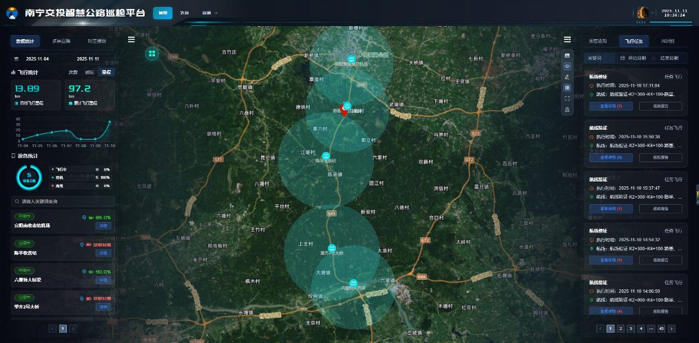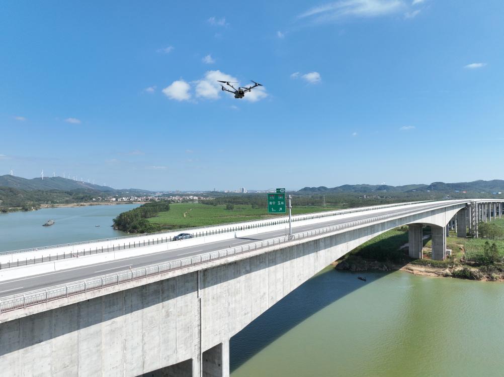 六賓高速全長約45.6公里,沿線地形復雜、結構物密集,傳統人工巡檢存在效率低、盲區多、安全風險大等痛點。南寧高速公司聯合技術單位,引入基于無人機機巢集群的智能巡檢系統,在全線布設5座無人機機場,形成“一機場一無人機”的協同部署,實現“自動起飛—精準巡航—智能識別—數據分析—自動回傳”全流程無人化作業。