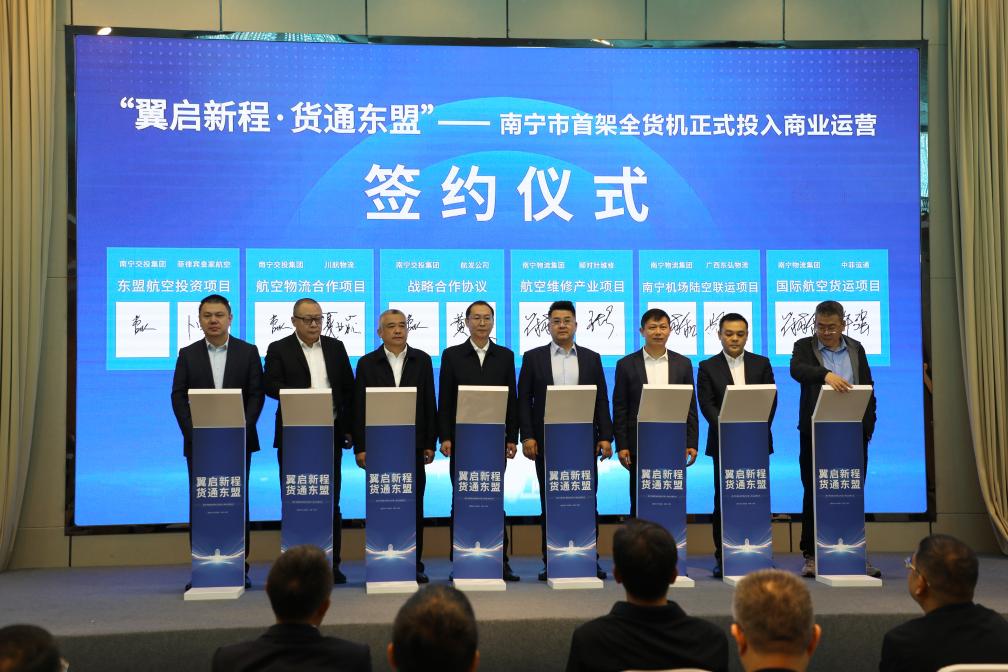 運營儀式現場,8家航空物流企業還共同簽署了戰略合作協議。各方計劃整合資源,“鏈”接各方在航線運營、商貿運輸、產業配套等方面的優勢,積極推進物流與貿易、加工、維修等航空產業融合發展,形成南寧市“運貿結合、以貿促工”的新格局。