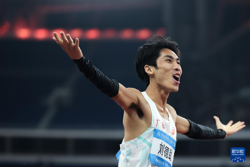 11月20日,廣西隊選手劉德助在沖線后慶祝奪冠。