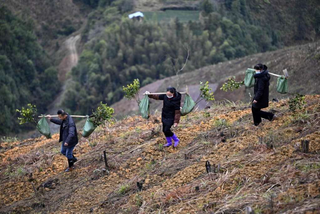 在廣西柳州市三江侗族自治縣八江鎮,人們挑著油茶苗準備上山種植。新華網發 黎寒池 攝