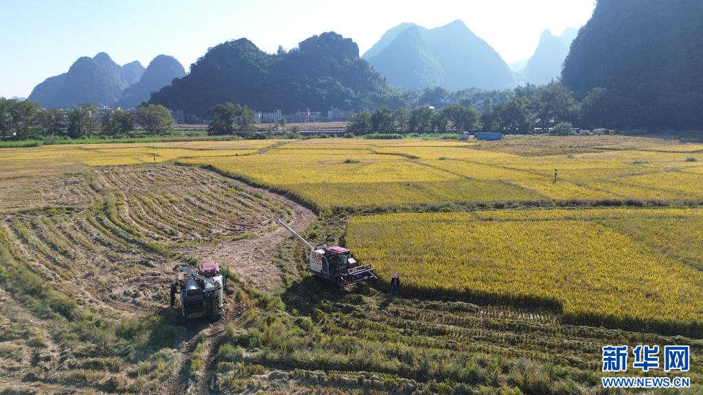 11月21日,在廣西賀州市平桂區沙田鎮馬峰村,農機手駕駛收割機收割晚稻(無人機照片)。