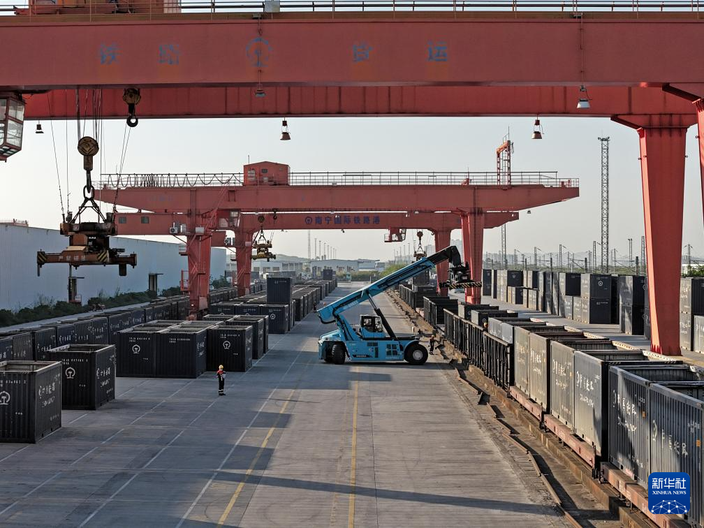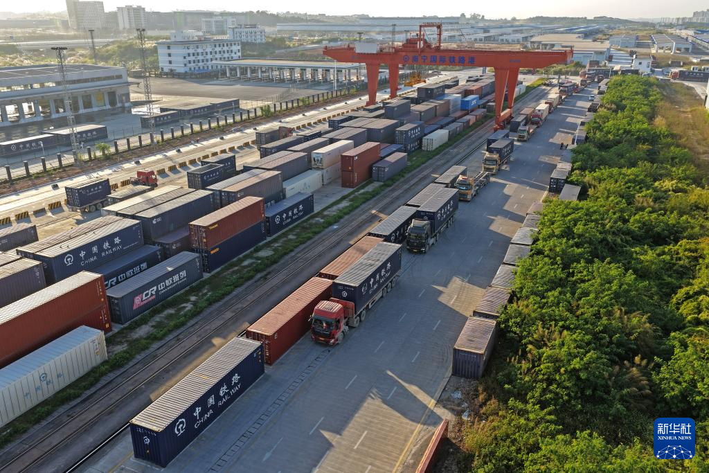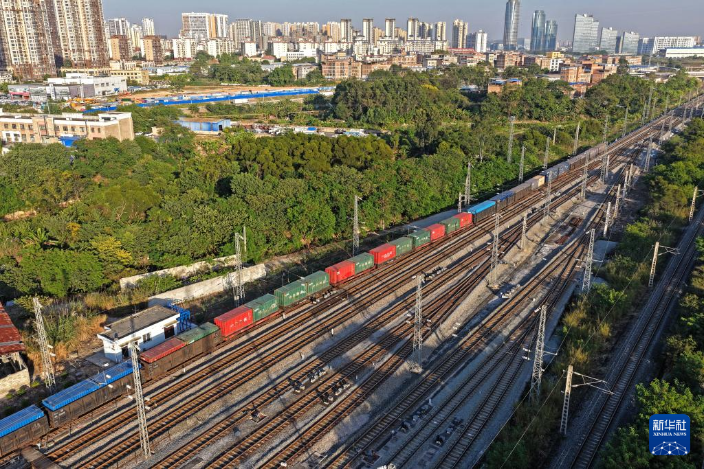 一列中越班列駛出南寧國際鐵路港(11月28日攝,無人機照片)。