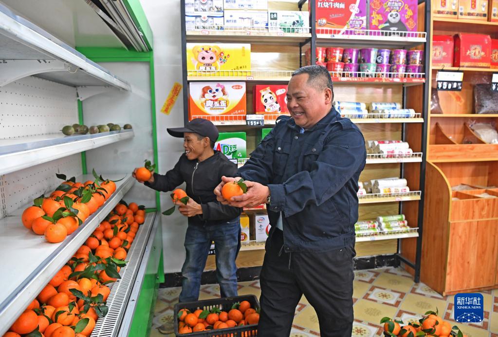 1月27日,在雄鷹農產品專業合作社的“邕寧鄉村振興農產品體驗館”,黎鎮(右)和合作社殘疾員工李子府擺放剛剛收購的沃柑。
