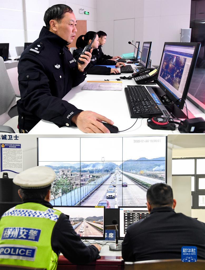 下圖是廣西梧州市公安局交警支隊高速一大隊民警通過公共視頻查看高速路上的返鄉車流(2022年1月28日新華社記者曹祎銘攝)。