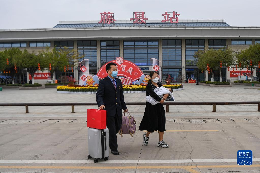 1月28日,廣西梧州市藤縣站鐵路工作人員(左)幫助一名從廣東方向回鄉的旅客提行李。