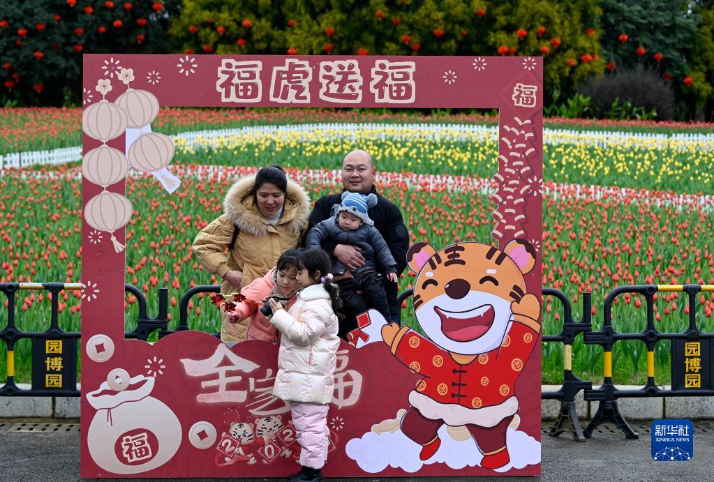 1月29日,在柳州園博園,市民在花海旁拍照合影。