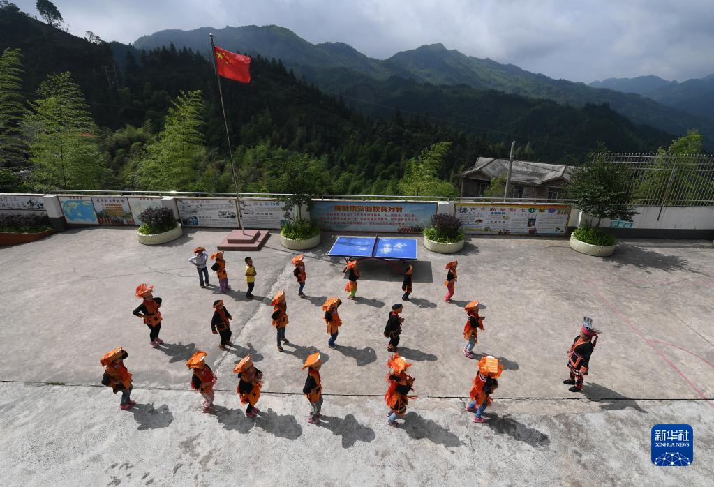 在廣西金秀瑤族自治縣忠良鄉山界教學點,學校唯一的老師陶鳳英領著學生做操(2019年6月4日攝)。