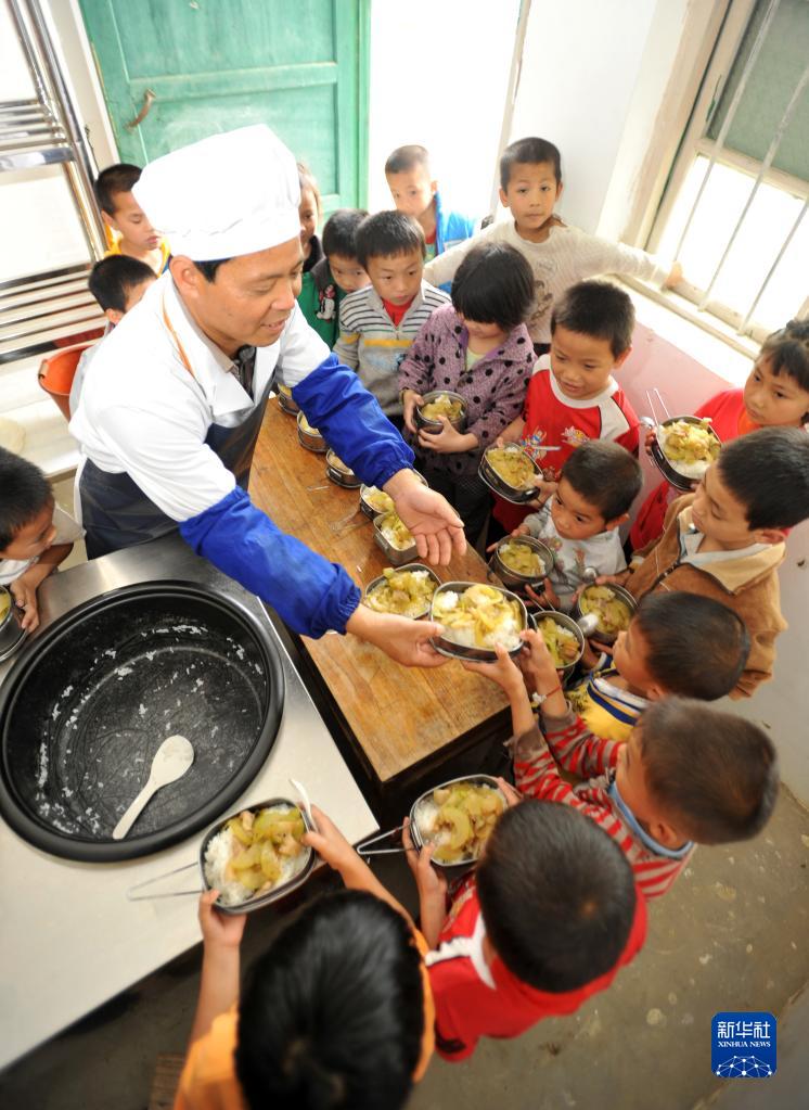 在廣西上林縣西燕鎮大龍洞村大龍洞小學刁望教學點,學校唯一的老師石蘭松在給學生打午飯(2013年5月7日攝)。