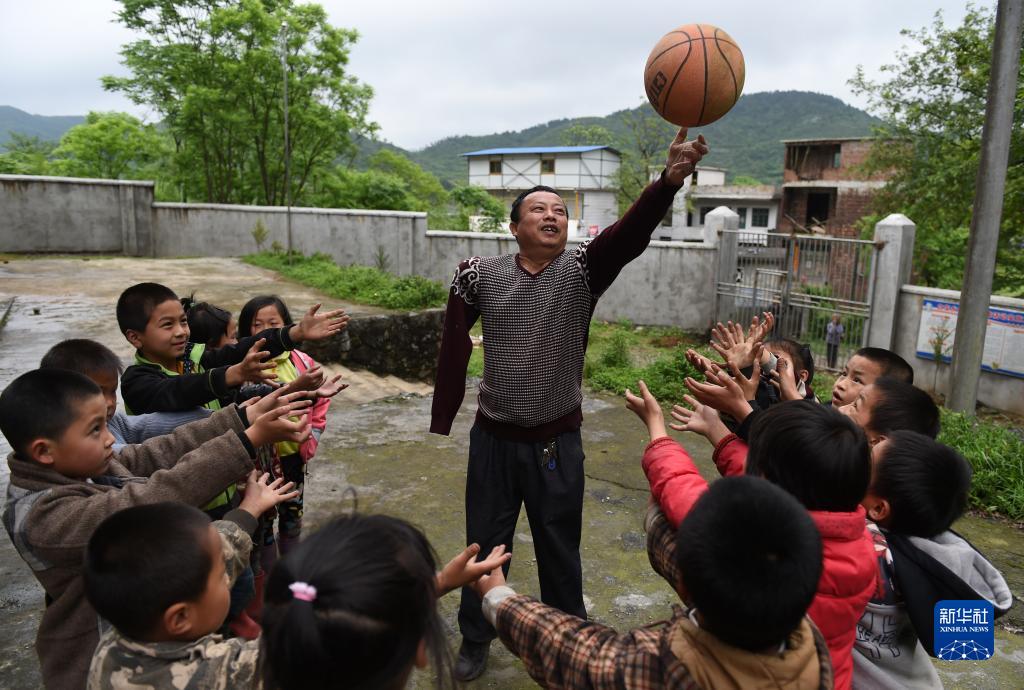 在廣西全州縣白寶鄉北山村小學,右手殘疾的唐廣芳老師在給學生上體育課(2016年4月26日攝)。