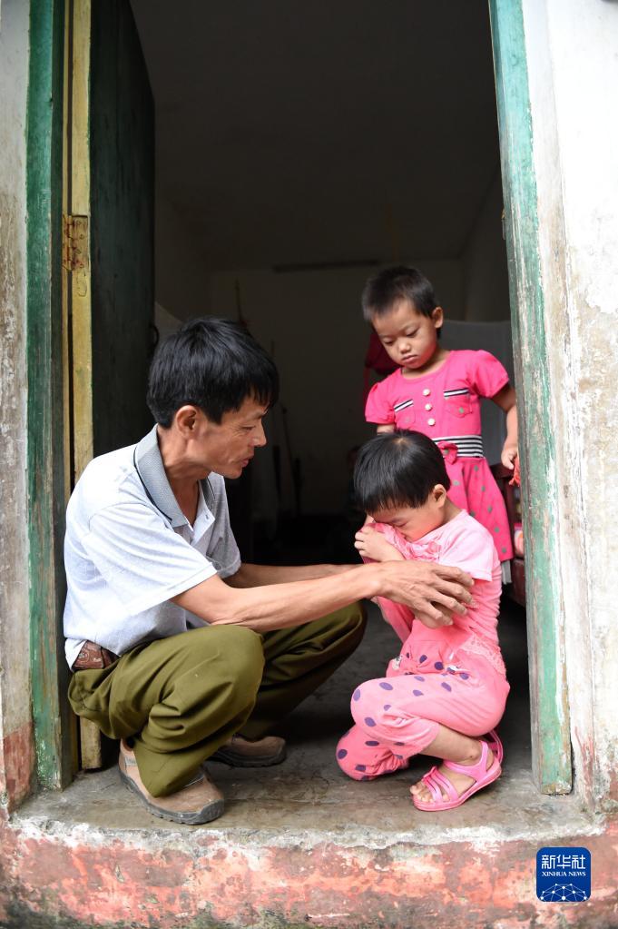 在廣西東蘭縣三石鎮泗爺小學,學校唯一的老師黃英雄在安慰一個因想家而哭泣的寄宿生(2014年9月10日攝)。
