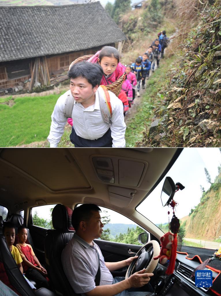 這是一張拼版照片。上圖:在廣西龍勝龍脊鎮江柳村,江柳村翁江小學唯一的老師在放學路上將一個走不動了的孩子背在背簍里,領著其他孩子一起回家(2013年2月26日攝);