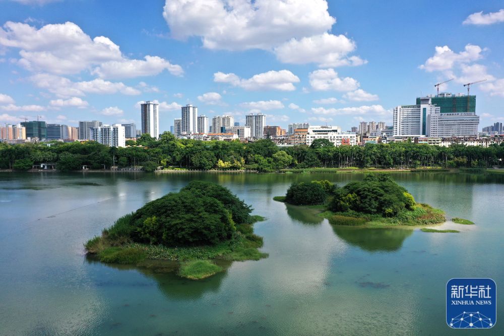盛夏時節,廣西南寧市南湖公園在藍天白云的映襯下,湖面明凈如畫,湖畔綠樹成蔭,風光秀麗。