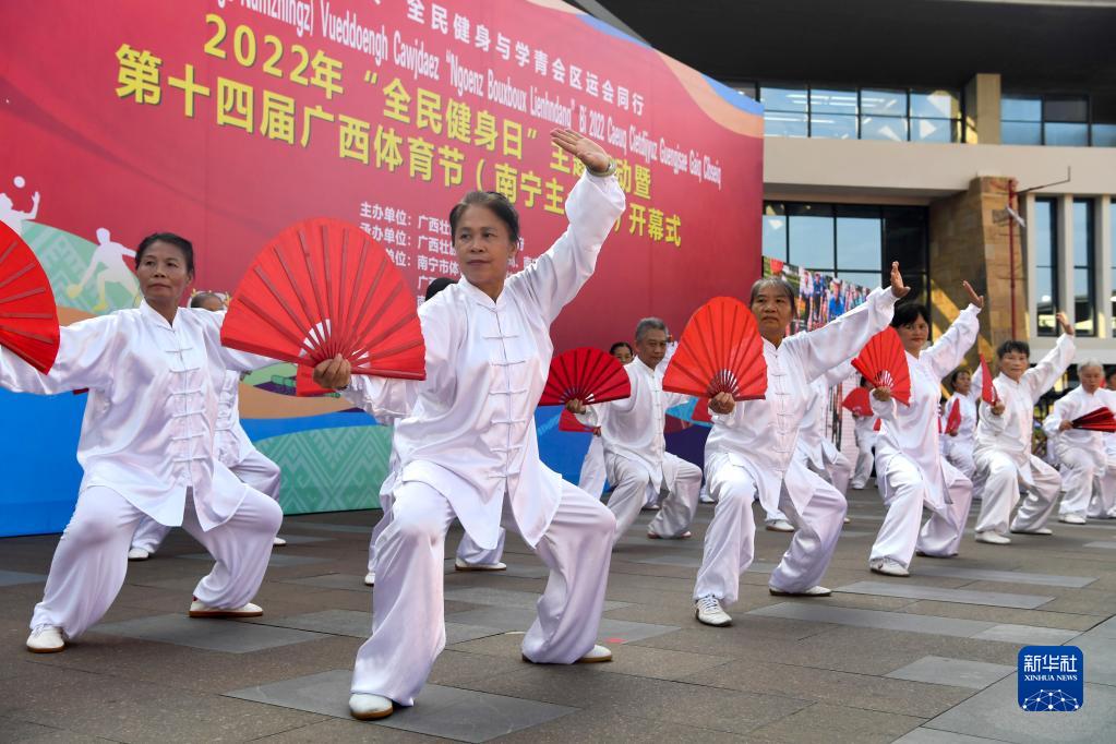 8月8日,全民健身項目展演人員在第十四屆廣西體育節開幕式上表演太極扇。