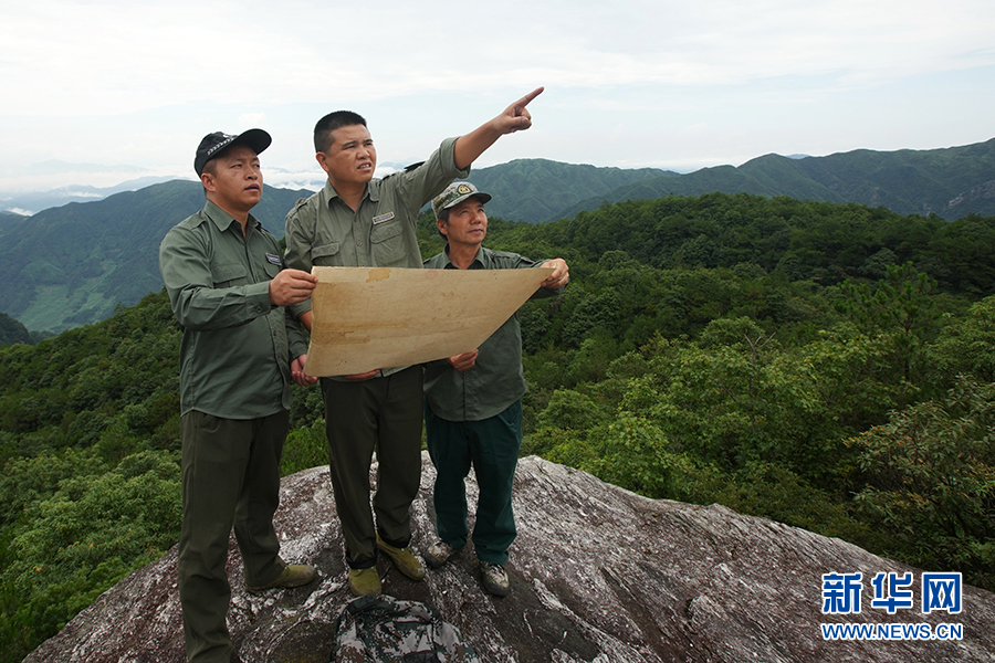 在廣西元寶山國家級自然保護區,羅定明(中)和同事在進行林地巡查。