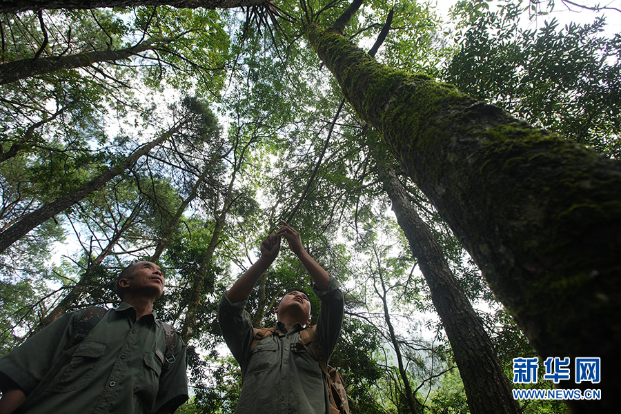 在廣西元寶山國家級自然保護區,羅定明(右)和同事在觀察樹木生長情況。