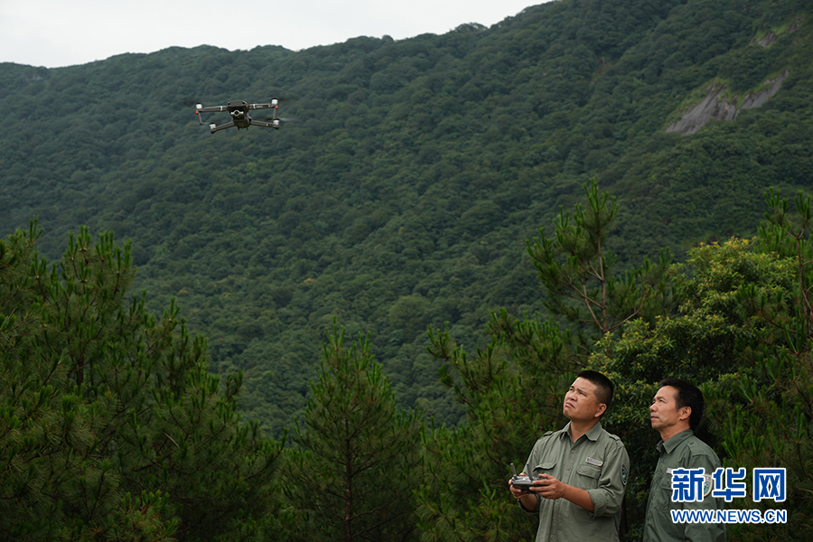 在廣西元寶山國家級自然保護區,羅定明(左)操控無人機準備巡查。