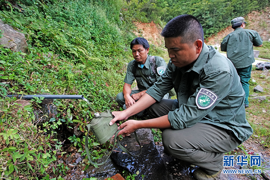 在廣西元寶山國家級自然保護區,羅定明(前)在巡山途中接山泉水解渴。