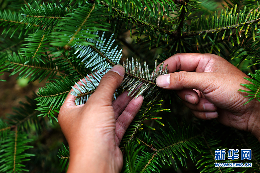 在廣西元寶山國家級自然保護區,羅定明在觀察元寶山冷杉野外回歸生長情況。